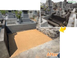 納骨室は霊園既設のコンクリートカロートです。時間が経って汚れているので、中をきれいに洗浄して、底に化粧砂利を敷きました。蓋石は前後に2枚に分かれています。