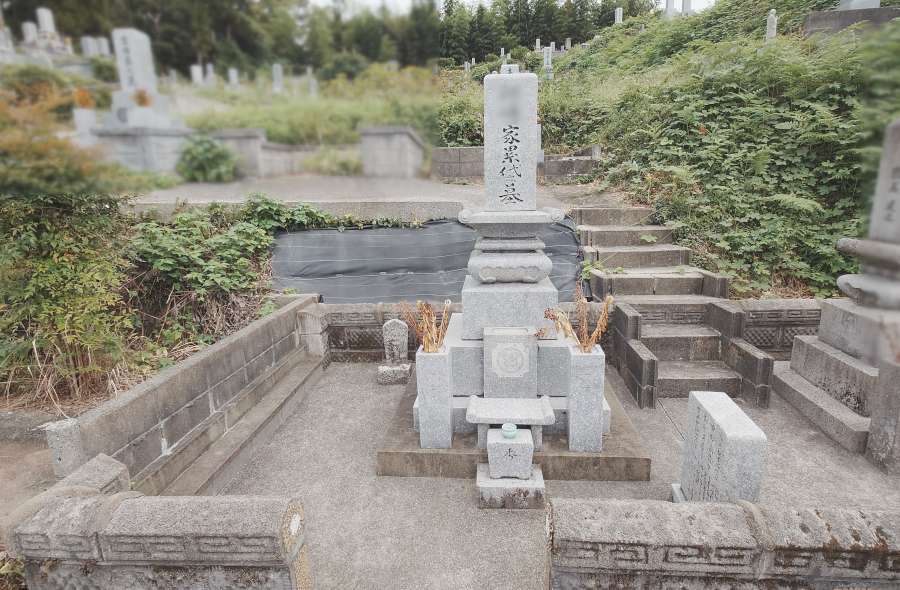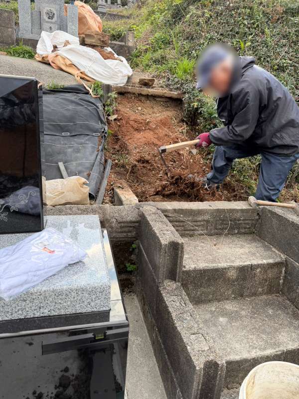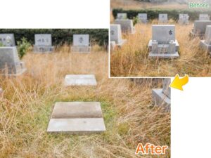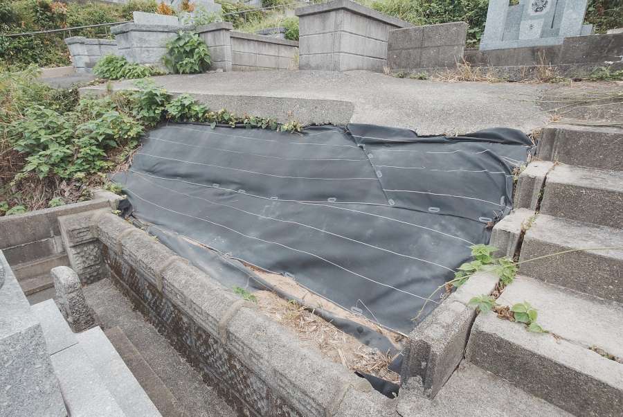 そのほかにも、墓地への入り口の階段にひびが入っていて不安定で、ご高齢のお母様にとって危ないことも心配されていました。お墓の後方の法面も土のままで防草シートが貼ってありましたので、「草が生えないようにしたい」とご希望でした。