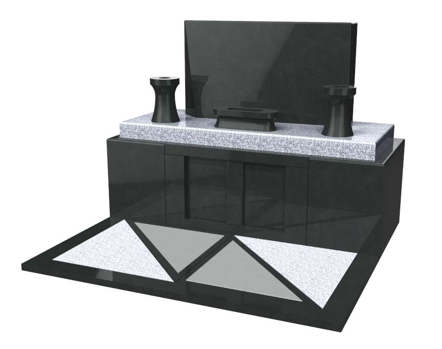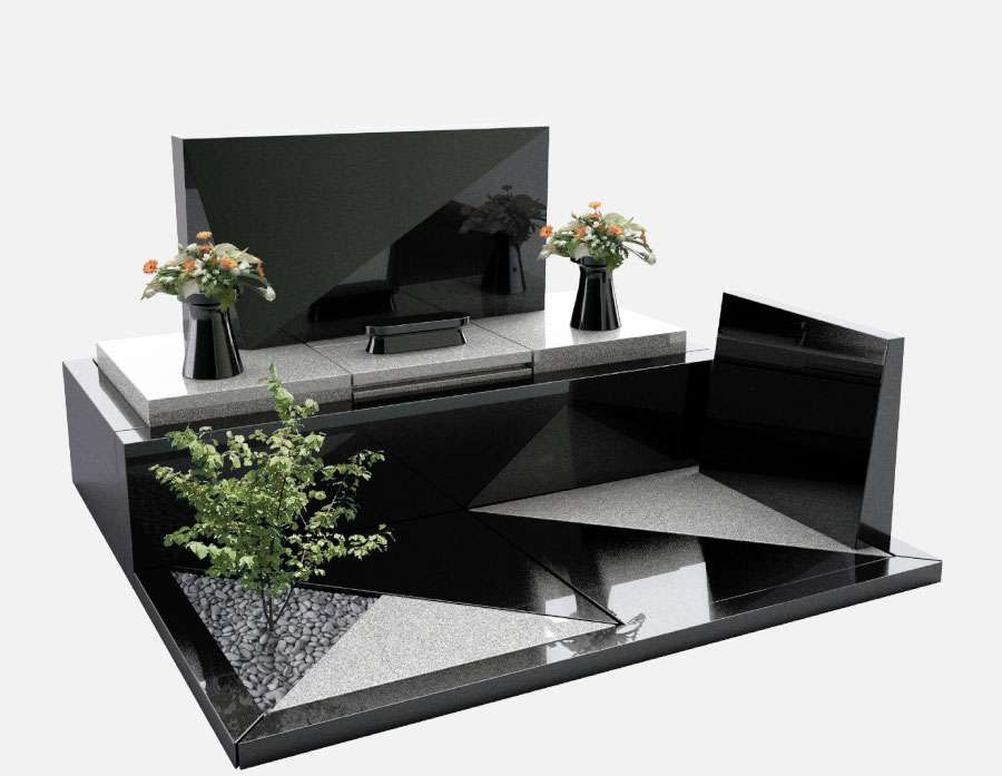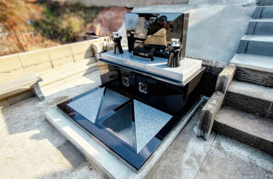 気に入られたデザインをもとに、墓地に合わせてリサイズし、オリジナルデザインのお墓をご提案しました。納骨室を地上に設ける「丘カロート」型にすることで、湿気がこもりにくく、出し入れもしやすくなります。使用する石は、インド産のYKDという黒御影石と、カンボジア産のOW-1という白御影石です。こちらでご了承いただき、工事に入らせていただきました。