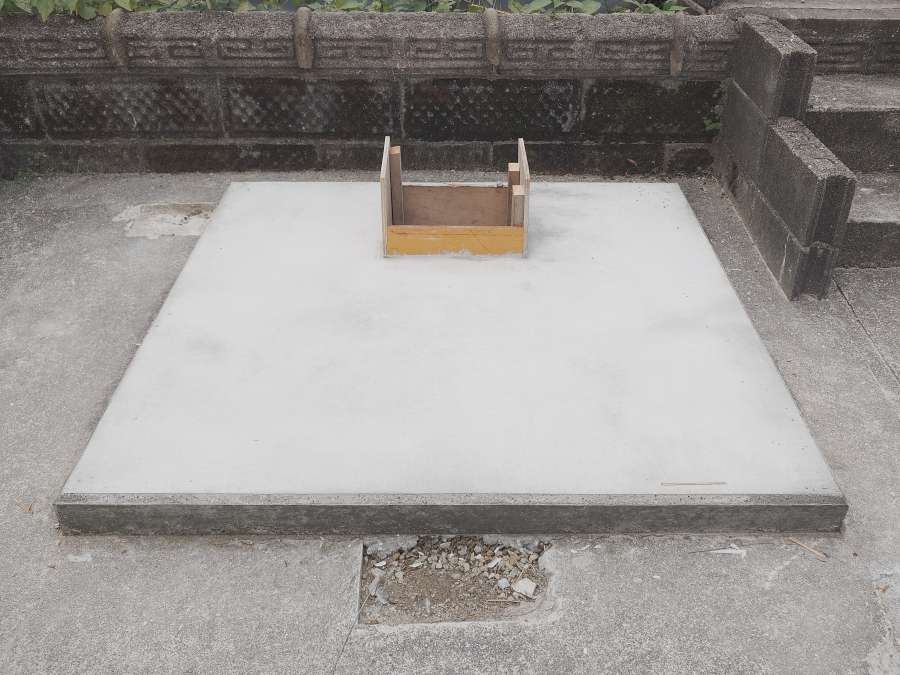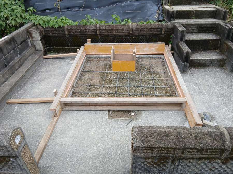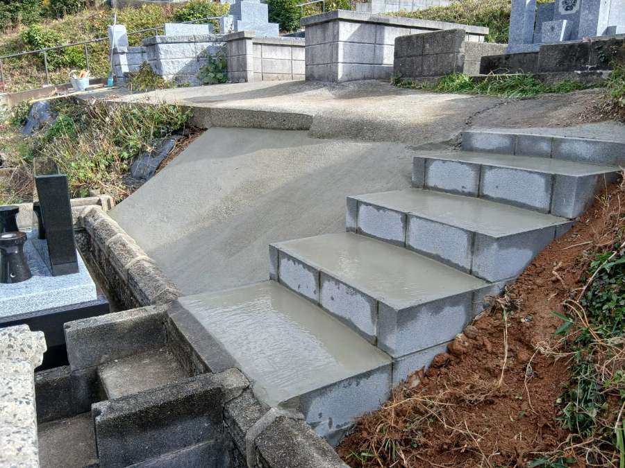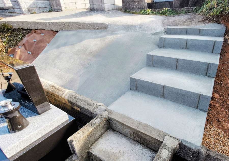 コンクリートがきれいに乾いた墓地周りです。階段はわずかに傾斜をつけて、水がたまらないようにしています。