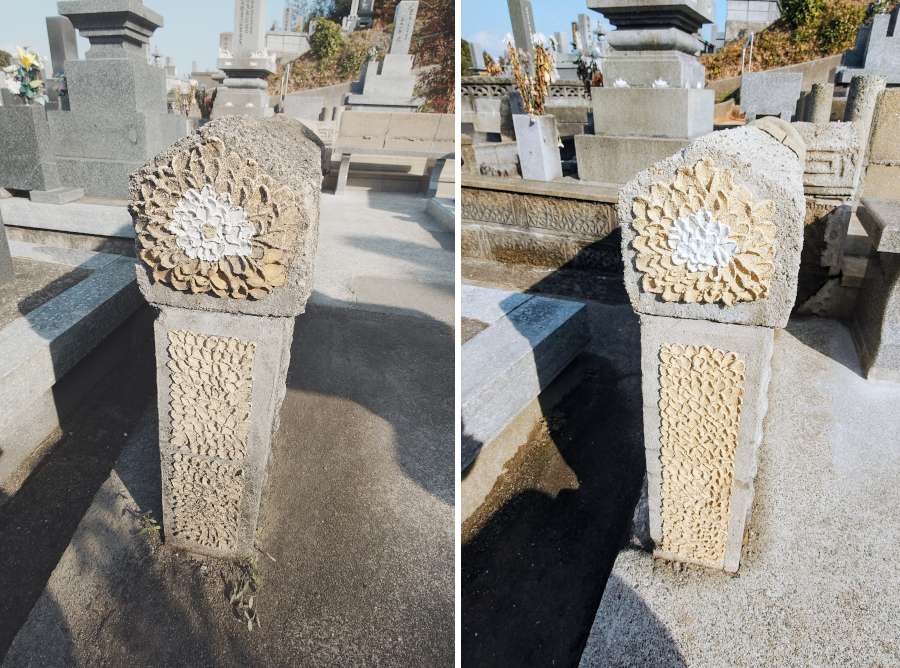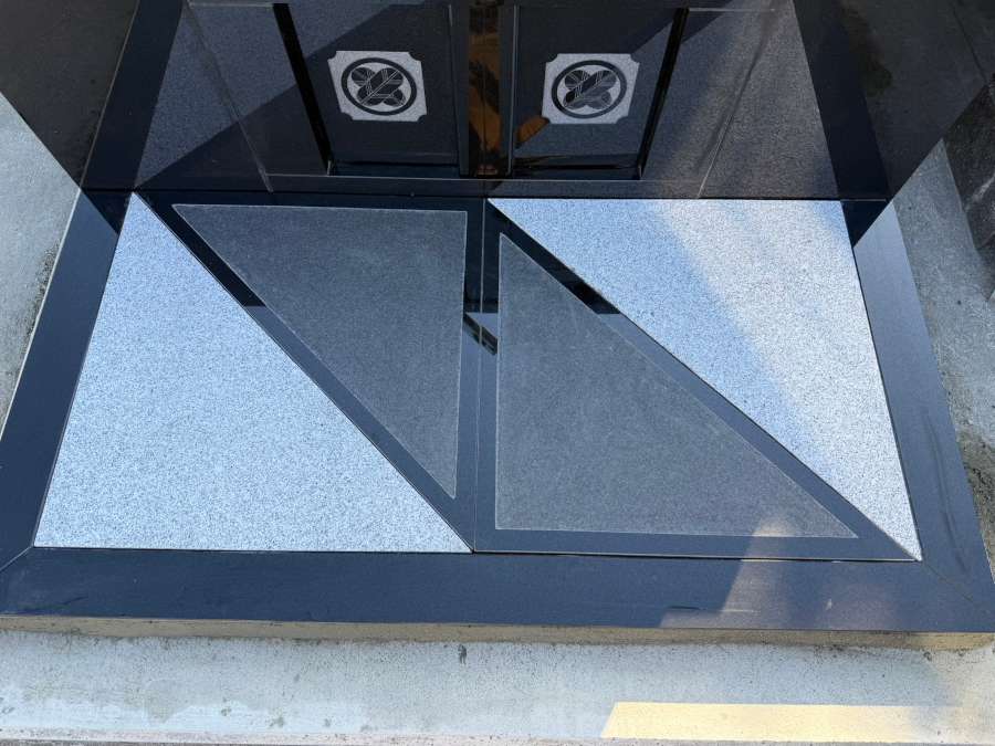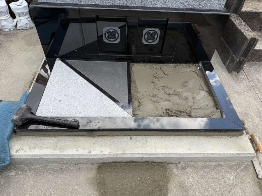 最後にお墓全体に目地コーキングを打ち、花立や香炉を設置して完成です。
