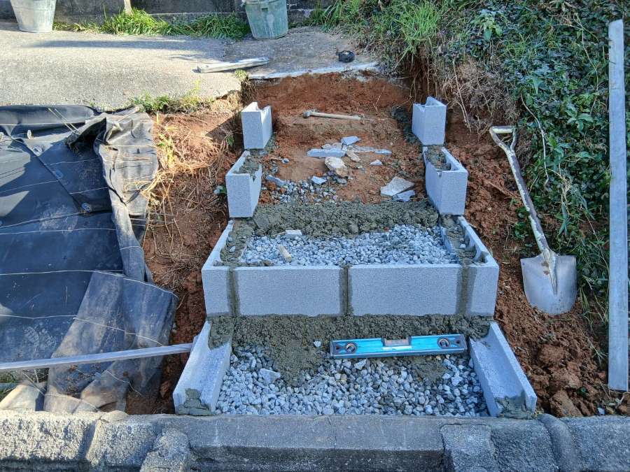 新しいコンクリートブロックで階段を作成しました。鉄筋を入れてコンクリートを流し入れる準備をしています。