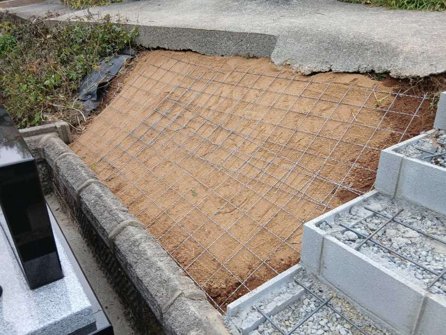 お墓の後ろの法面は、古い防草シートをはがして整地し、真砂土を入れてメッシュ筋(強度の高いもの)を入れ、コンクリートで固めて左官仕上げにしました。