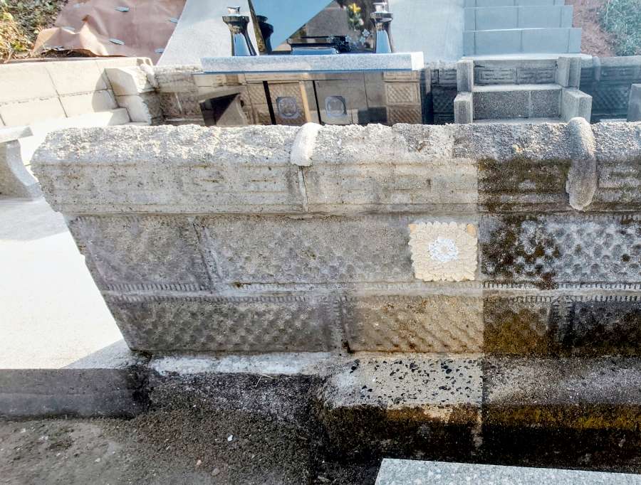 お墓の周りの土間や囲いのコンクリートブロックの壁は、クリーニングをして汚れを落としました。