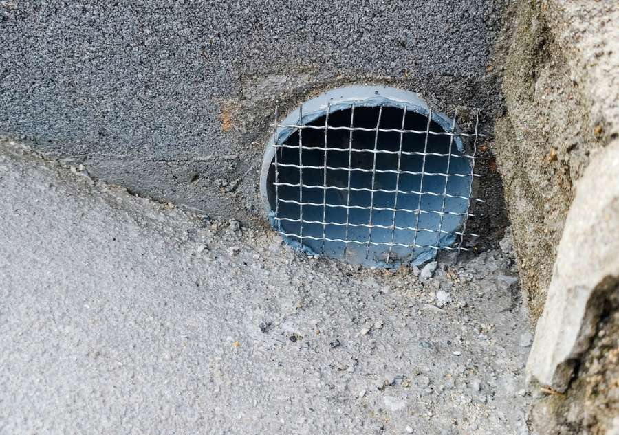 階段の下には、水抜きの穴も設置しています。動物の侵入を防ぐため、メッシュを付けました。