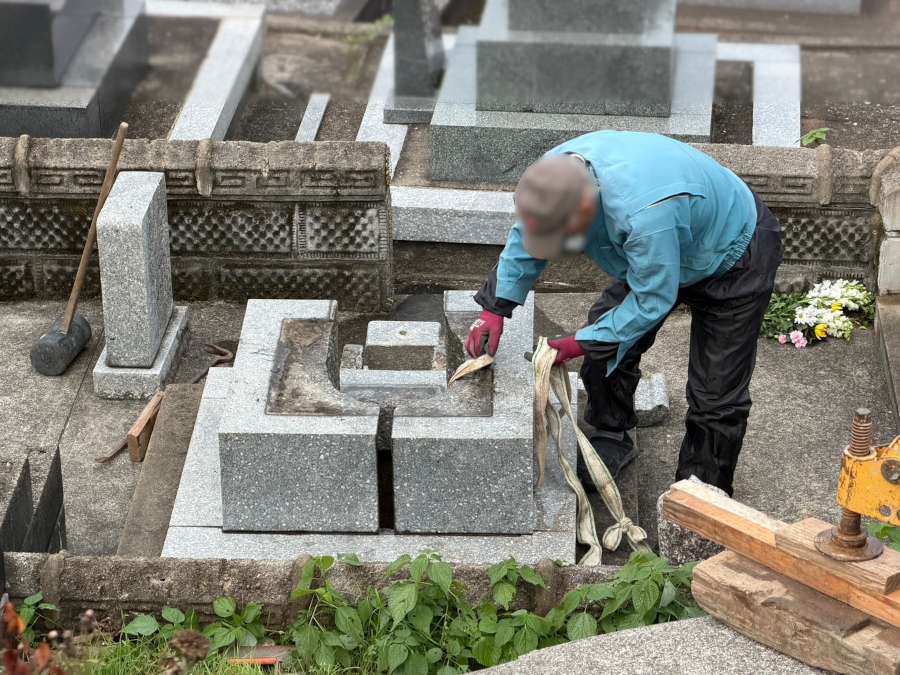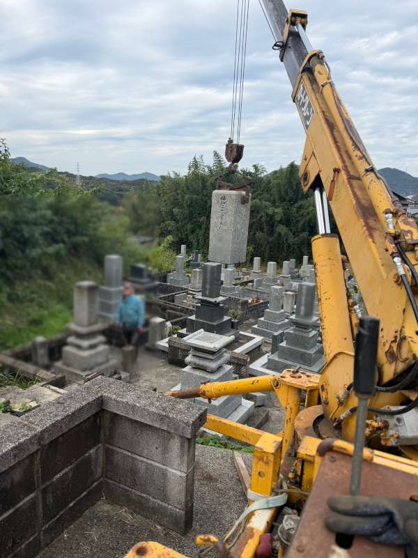 工事の様子です。まずはクレーンを使って古いお墓を解体・撤去します。
