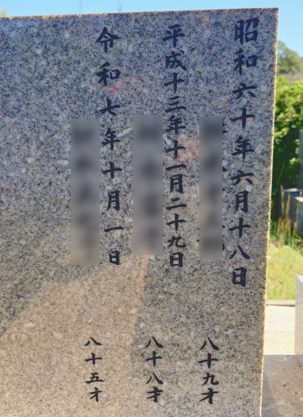 既存の彫刻にあわせて原稿を作成し、違和感なく仕上げました。また、彫刻にあわせて、お墓正面や側面の建立者名、花立の家紋、法名碑額字部分など、すべての彫刻を白色からより耐久性がある黒色へ入れ替え。建立から20年以上が経ってお墓全体の目地もとれていたので、お墓本体、石貼り部分なども目地を打ち直しています。